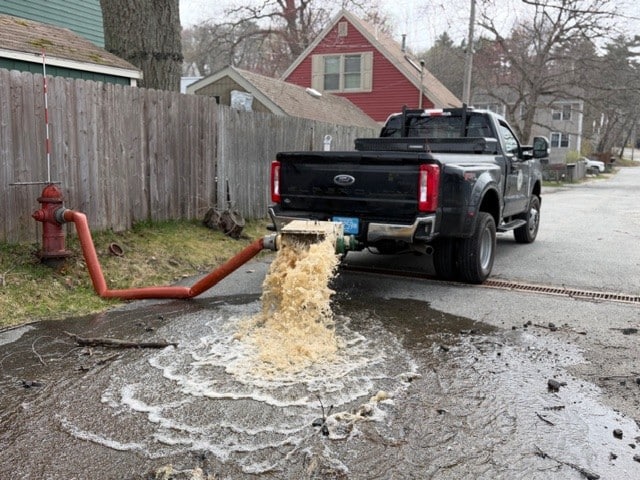 Hydrant flushing helps ensure water quality and removes sediment in the water main. It also verifies ample water flow for firefighting. Low water pressure, discolored/milky water, air in pipes and at times, no water, may be experienced during flushing. When flushing in your area do not use your water to prevent it getting pulled into your home. When flushing is complete in your area, or in the morning, running your cold and hot water faucets for 5-10 minutes should alleviate this problem. Merrimac Water